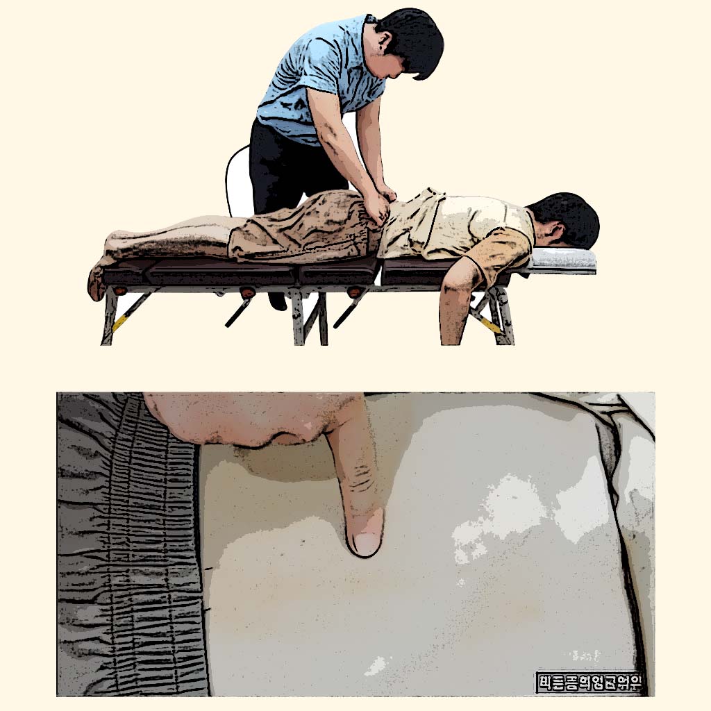 사진과 같이 양쪽을 동일한 압력으로 눌러 좌우의 압통 반응이나 민감도 차이를 확인함으로써 요추 회전 방향을 평가하게 됩니다.