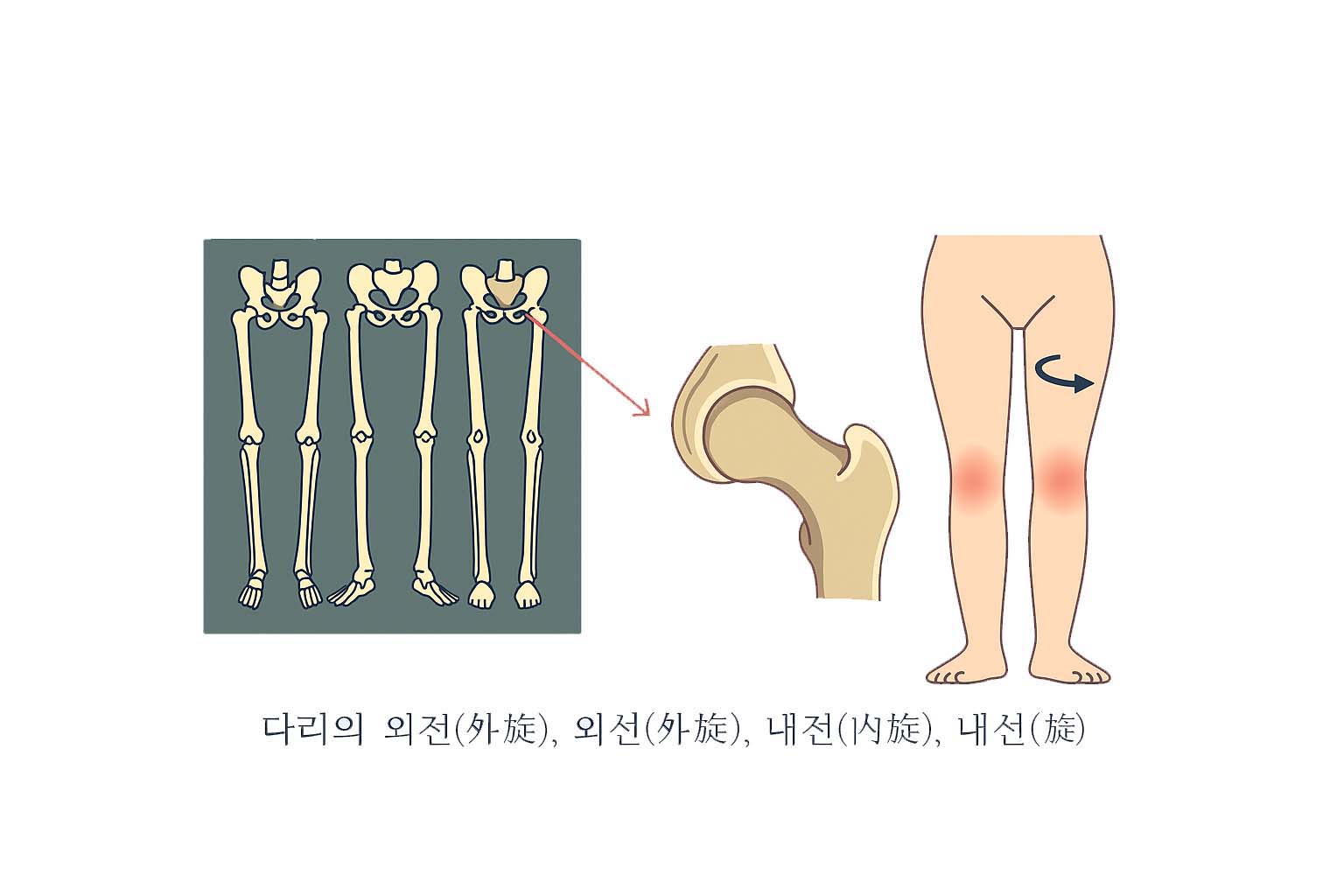 이를 평가하기 위해 일반적으로 앙와위(바로 누운 자세)와 복와위(엎드린 자세)에서 다리 길이를 비교합니다. 이때 발의 각도를 살펴보면 다리의 외전 상태, 고관절 위치, 골반의 비틀림 여부를 간접적으로 판단할 수 있습니다. 정상적인 경우 발각도는 약 40~45도 정도가 유지되며, 길어진 쪽 다리나 짧은 쪽 다리의 벌어짐 정도를 관찰해 골반과 척추가 단순히 틀어져 있는지, 아니면 복합적인 변형이 있는지 파악하게 됩니다.