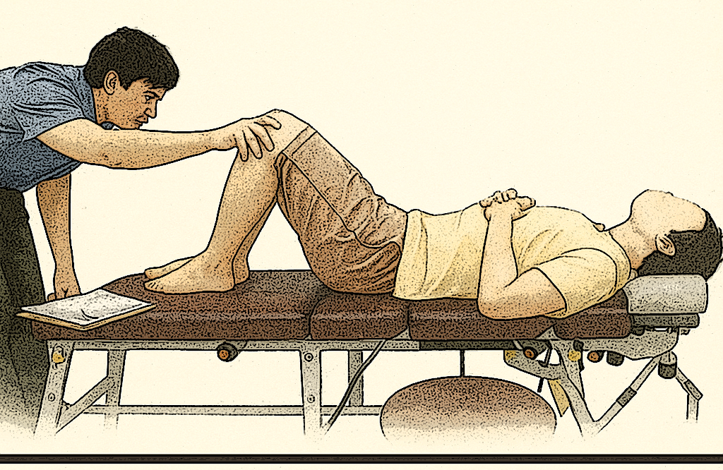 이어지는 포지션 3에서는 무릎을 굽힌 상태에서 양쪽 다리를 천천히 엉덩이 쪽으로 밀어 굴곡의 각도를 비교합니다. 이때 양쪽 다리의 눌림 정도나 각도가 다르게 나타나면, 이는 천골과 장골이 함께 틀어져 있는 복합적인 변형 상태가 존재함을 시사합니다.